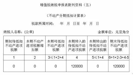 适用分期抵扣的不动产进项税额,60%的部分于取得扣税凭证的当期从销项税额中抵扣;40%的部分为待抵扣进项税额,于取得扣税凭证的当月起第13个月从销项税额中抵扣。在附表五第2列“本期可抵扣不动产进项税额”和附表二第10栏“本期不动产允许抵扣进项税额”中反映。详情【填写案例三】