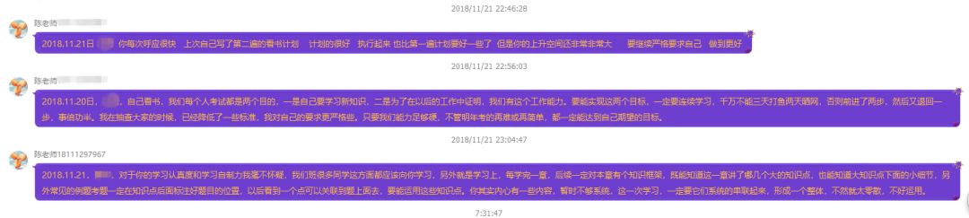 第八步:具体执行方式:执行学习计划过程中,班主任会在晚上或周末随机抽查检视,方式多样,打电话、视频,监督核查学生是否严格在计划的时间学习计划的章节或轻1的内容,关注学习的效果和方法是否科学高效,根据每个学生的基础进行一对一的辅导和答凝,一个不落下,一个不放弃,并且对次抽查的情况进行记录,在学习群中进行公示。